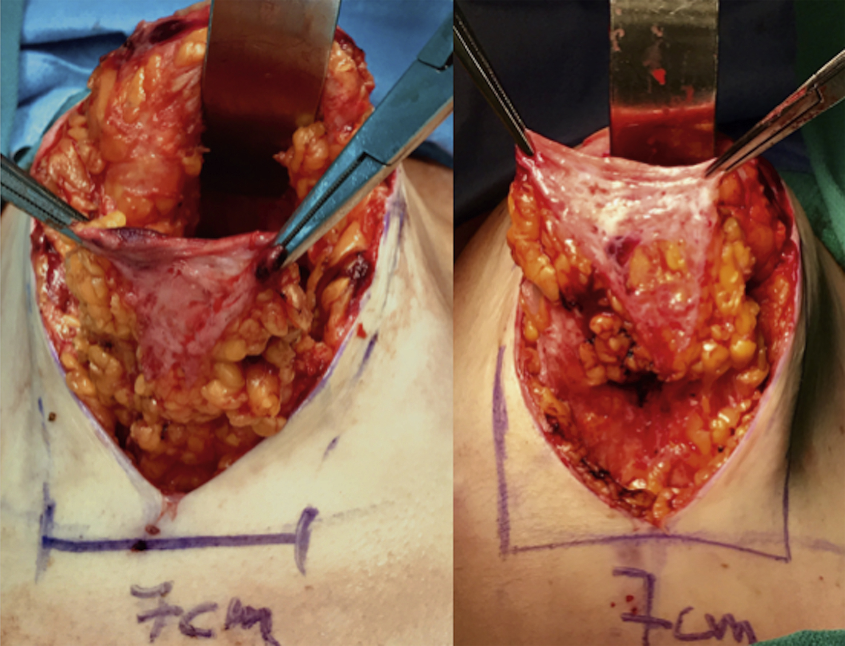 Surgery starts with de-epithelialization of the areas previously marked: the NAC pedicle and the inferior parenchymal flap. Parenchymal detachment from the pectoralis major muscle follows, being performed before the superior NAC pedicle undermining and sparing the de-epithelialized inferior flap, as described by Ribeiro et al. Care must be taken in the progression of parenchymal release from the pectoralis fascia, preserving the most superior segment, since it will be source of the NAC supply.