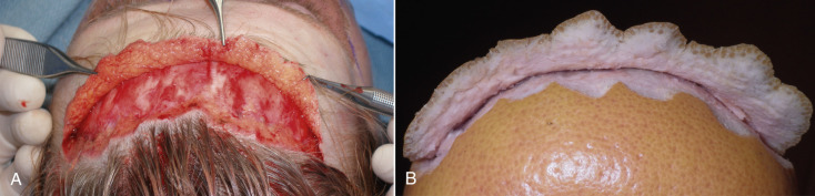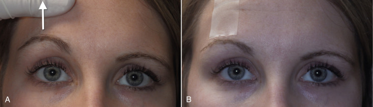 Being a subcutaneous procedure, there is less edema and ecchymosis compared with other browlift techniques. Since this is a skin excision technique, stability is excellent, and the result is immediately evident. As the skin is excised all across the horizontal hairline and the area resutured, the suspension is dispersed across the entire brow hairline ( Fig. 4.10A ). This is in extreme opposition to the EBFL, which only has several fixation points that are suspended with extreme tension in selected regions ( Fig. 4.10B ). An additional advantage is that TFSBFL, being a subcutaneous technique, will have an impressive effect on the effacement of vertical and horizontal forehead rhytids. This is possible because the skin is dissected from the underlying frontalis muscle and then tightened, which significantly improves horizontal wrinkles ( Fig. 4.11 ). Subperiosteal browlifts are not nearly as effective at improving horizontal forehead wrinkles, because they cannot effectively be addressed from the subperiosteal plane. Direct access to the brow depressors is another advantage when compared with endoscopic access; the treatment of these muscles is easier under direct vision.