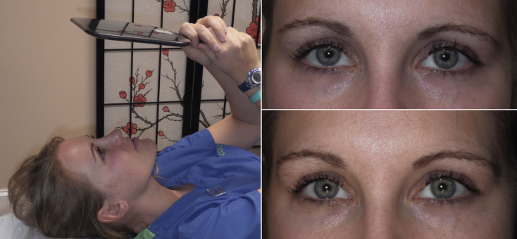 To give the patient (and surgeon) a chairside prediction of the possible result, the brow can be simply elevated with the surgeon’s finger, while the patient looks in the mirror. Using clear tape on the brow and forehead to lift the brow is another way to convey a result ( Fig. 4.1 ). Lying the patient horizontal in a reclining chair will usually serve to position the brows in the position very similar to a natural browlift and is a means of showing the patient an anticipated result ( Fig. 4.2 ). Digital imaging can also be used for prediction.