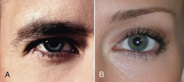 Male brows are usually less peaked and sit at the level of the orbital rim in youth and descend with age. The youthful female brow generally sits above the level of the superior orbital rim ( Fig. 4.3 ).