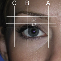 The youthful female brow is a delicate structure that tapers from a thicker and squarer medial portion to a fine point laterally. Classical proportions dictate the tail of the brow tapers at the lateral orbital rim, the peak of the brow at the lateral limbus, and the medial brow at the medical canthus. Classical proportions show the region of the youthful female brow between the lash and the brow to be one-third the distance below the crease and two-thirds the distance above the crease ( Fig. 4.4 ).