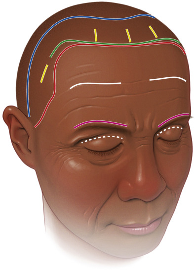 The coronal browlift is an aggressive open technique that utilizes a trauma-type incision from ear to ear across the scalp. Coronal browlifting was once the most popular technique but has fallen out of popularity owing to drawbacks, such as over-elevated hairline, hair loss, nerve damage, and the sheer aggressiveness of the procedure. It is simply too aggressive and the scar and related problems can be significant. Some of the more common approaches for coronal lift are shown in Fig. 4.6 .