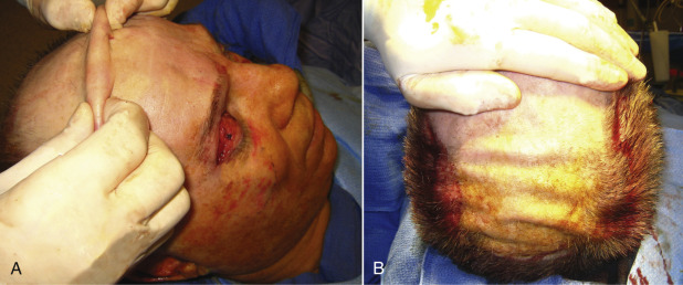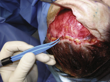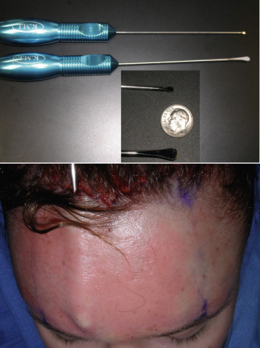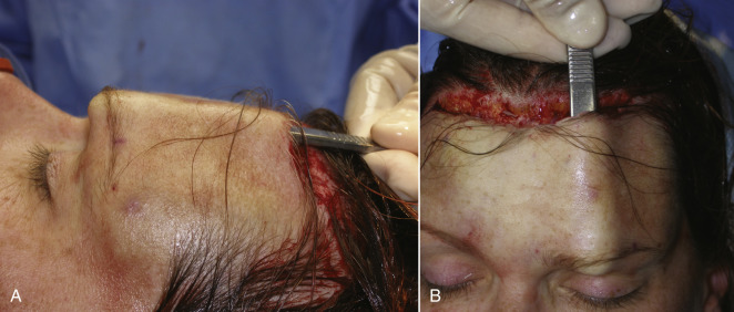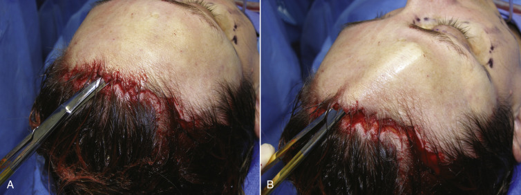Some surgeons prefer to pretunnel or predissect the subcutaneous flap with blunt dissectors ( Fig. 4.39 ) as similarly performed in facelift surgery. Although this is not a necessary step, it is very helpful, especially for novice surgeons, to find and stay in the correct surgical plane and avoid trauma to the thin frontalis muscle complex.