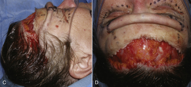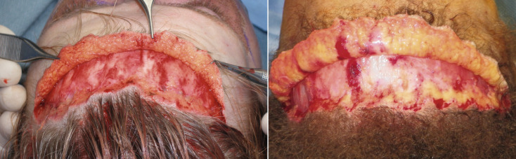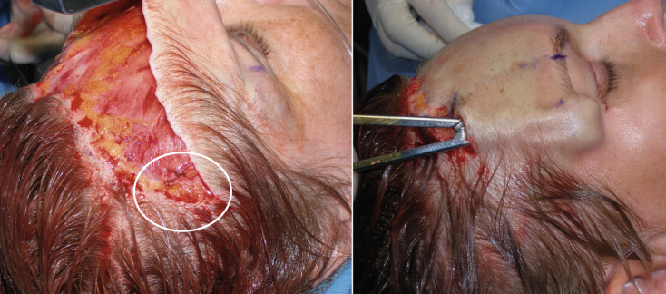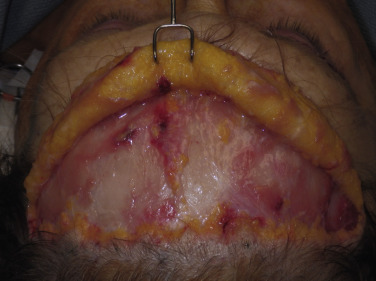 It is imperative to remember that this is lipocutaneous flap performed in a plane above the frontalis muscle. The flap should have adequate fat on the dermal surface ( Fig. 4.45 ). The frontalis muscle is very thin in some females and sometimes translucent. Gentle dissection in the subdermal, premuscular plane above the muscle is essential to preventing injury.