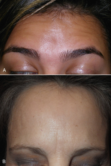 Patients with permanently tattooed eyebrows can be problematic, especially if the tattoos are not symmetric or extremely peaked. When the skin is excised and the forehead retracted, an unnatural result can occur. Any patient with permanent tattooed brows should be closely evaluated for result when the brows are manually lifted, and the problem discussed while the patient looks in a mirror. Some patients have virtually no eyebrow hair and draw them on daily. This is not a problem, as they can be drawn at any height postoperatively by the patient. This type of patient is actually the best browlift candidate, as the operation improves their periorbital aging and the brows can be drawn anywhere the patient desires.