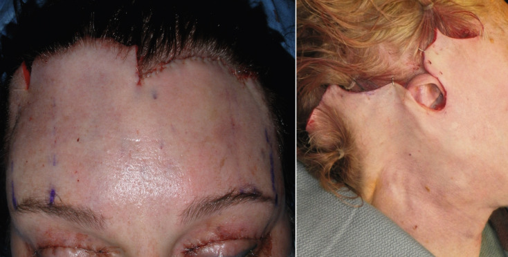 The learning curve is less complex than the EBFL, and this approach is very similar to facelift surgery, in that it involves dissection and skin excision. The TFSBFL is simply a facelift for the forehead and brow. Subcutaneous dissection, flap development, skin excision, and resuturing techniques are virtually identical to rhytidectomy ( Fig. 4.9 ).