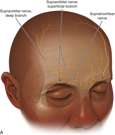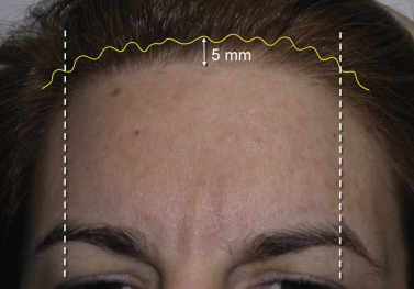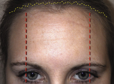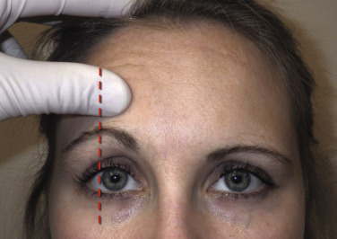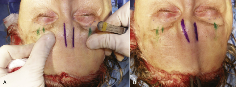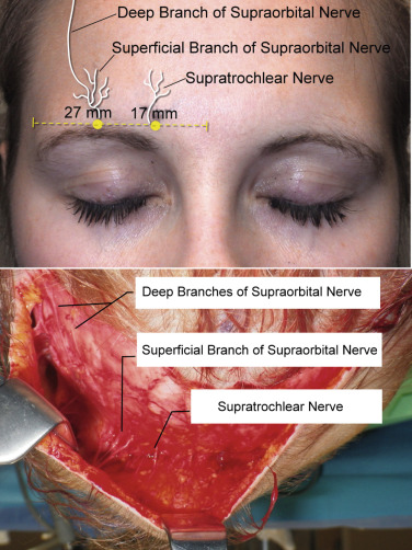 Additional markings commonly used include the supratrochlear nerves, which are located approximately 17 mm from the midline and the supraorbital nerves, which are approximately 27 mm from the midline ( Fig. 4.15 ). Marking the neurovascular bundles allows the surgeon to be mindful of significant anatomy. Blepharoplasty markings are also performed if planned at the same procedure.
