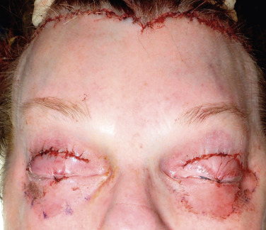 When performing blepharoplasty before the browlift, the lid incisions are closed before scalp excision is performed. The surgeon can therefore decide how much excess forehead skin can be removed without producing significant lagophthalmos. Enough skin must remain to close the lids, and this is taken into account during excess scalp excision ( Fig. 4.19 ). Novice surgeons should avoid simultaneous blepharoplasty or perform it at the end of the case to avoid significant lagophthalmos.