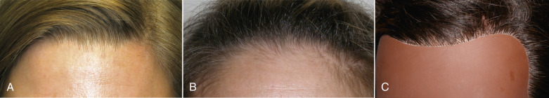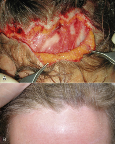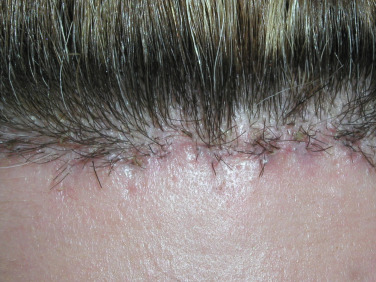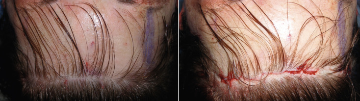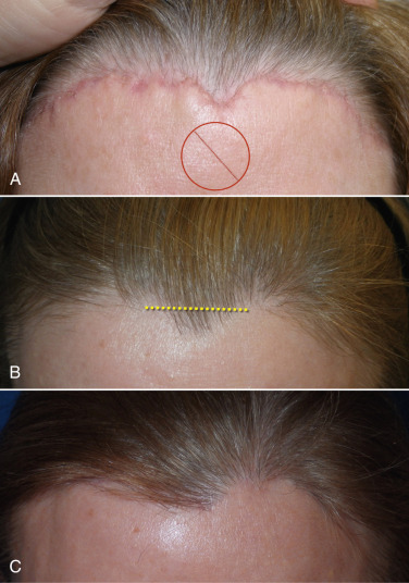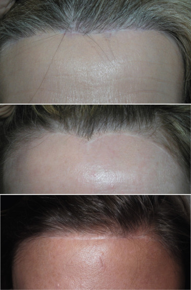 As there are very few straight lines in human anatomy, these prefollicular scars can look unnatural. Also important is the fact that there is no such thing as a “natural hairline.” Normal hairlines are not lines at all, but very incidental and random patterns of follicles. Only a toupée or a poor hair transplant produces a true “hairline.” Making a straight line prefollicular incision on a patient’s forehead can make them look unnatural, with a visible and often hypopigmented scar ( Fig. 4.22 ).