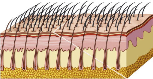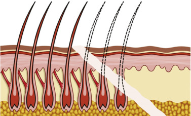 The reason this incision heals so well when performed properly is that the transected hair follicles can regrow through the incision and camouflage the scar. In order for this to occur, the bevel of the incision must transect the hair shafts and follicles at various angles. The most anterior and usually fine vellus hairs may be totally excised and be lost. Generally, this small amount of hair loss is negligible and not noticeable in the final result. The next rows of follicles are transected close to the hair bulb and these are the hairs that will regrow through the scar. The posterior-most hair shafts will be transected towards the top of the shaft and these will also grow back ( Fig. 4.30 ).