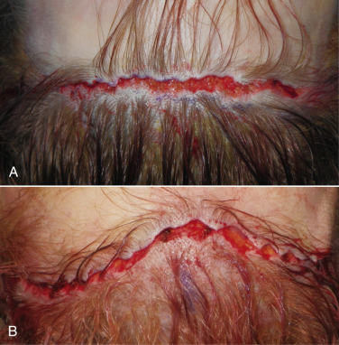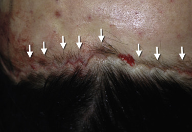 Although some hair may be excised when trimming the flap, it should be negligible if the incision is made correctly ( Fig. 4.31 ). It may appear that more hair is lost when incising, but it is important to remember that some of the rows of follicles that appear to be cut will actually regrow through the scar; in effect these hairs are cut but not lost.
