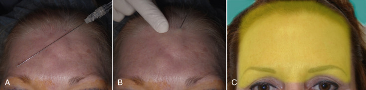 As stated earlier, this procedure can be performed with tumescent anesthesia only but is more commonly done with sedation. For tumescent technique, the entire brow and forehead is injected with typical Klein’s solution (0.1% lidocaine with 1 : 1 million epinephrine) with a 23-gauge spinal needle. The tumescent solution is injected from the hairline to the superior orbital rims and laterally to the temporal crests. It is critical that the local anesthesia is injected in the subcutaneous plane, as this is where the dissection will occur. The tumescent solution also produces hydrodissection between the dermis and frontalis, which aids in the actual surgical dissection. The actual hairline where the scalpel incision occurs is injected with 2% lidocaine 1 : 100,000 epinephrine. If the surgeon does not want to use tumescent anesthesia, the entire brow can be injected with the standard 2% lidocaine with epinephrine. Again it is important to infiltrate from just above the planned incision to the superior orbital rims and the entire forehead between the temporal crests ( Fig. 4.38 ). Unlike liposuction, excessive volume of tumescent is unnecessary and only enough fluid to provide anesthesia and hemostasis is used.
