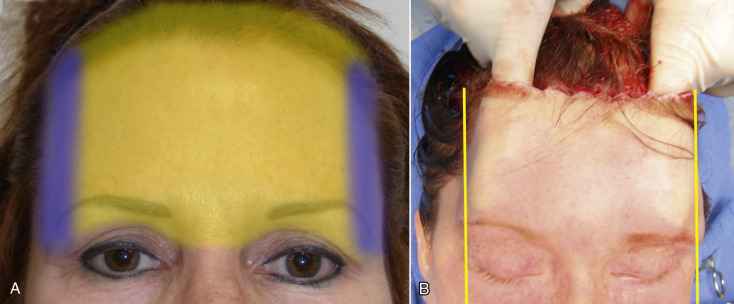 An important factor to keep in mind when choosing a browlift technique is whether or not it elevates the patient’s hairline. A long forehead and high hairline are not considered aesthetic for females. Coronal and endoscopic browlift approaches will both elevate the anterior hairline along with the brows. The endoscopic approach separates the deep tissue planes and elevates the brow and forehead by lifting the redundant skin and repositioning it posteriorly ( Fig. 4.7 ). The TFSBFL does not raise the hairline when lifting the brow and forehead.