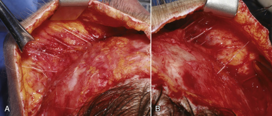 After the pretunneling maneuver, the actual flap dissection is begun. Again, this is a subcutaneous dissection made below the dermis and above the frontalis muscle. The dissection is performed with facelift scissors, and it is imperative to remain in the subcutaneous plane and not damage the frontalis muscle or the sensory nerves that lie over it. The surgeon must remain cognizant that long branches of the supratrochlear and supraorbital nerves course from the superior orbital rim to the scalp ( Fig. 4.40 ).