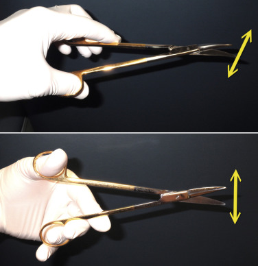 The bevel of the incision is critical and must transect several rows of hair shafts and follicles at different heights. In order for this to occur, the scalpel with a No.11 blade must be held about 10–20 degrees above the horizontal plane, as shown in Fig. 4.24 . This angle and scalpel movement is similar to filleting a fish, except the blade is not totally horizontal. The reciprocal motion of filleting a fish is used when the incision is made.