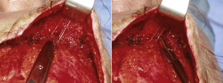 Scissors dissection is begun at the incision line as the scissors enter the subcutaneous plane. If the flap has been pretunneled, this dissection is easy and can be accomplished by “nipping,” pushing, and spreading with the scissors ( Fig. 4.41 ). This initial scissor dissection can be performed “blindly” (indirect vision) to a point several centimeters above the orbital rim to prevent damage to the supratrochlear and supraorbital nerve branches. Distal to this, all dissection must be completed with direct vision, as the neurovascular bundles are easily visualized. A lighted fiber optic retractor greatly facilitates the surgery. In the midline glabellar region, blunt or sharp dissection can be performed to the nasal radix without fear of nerve injury.