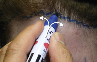 Similar to blepharoplasty, correctly marking this browlift incision is critical. Marking the incision 5 mm posterior to the hairline with a conventional “Magic Marker” type felt marker with an angled tip, provides a basis for the incision outline. The marker is used to mark triangles by rotating the tip while marking. The first mark is made with the tip held at a 45-degree angle to the left, then the marker is rotated 45 degrees to the right to make the corresponding angle. This is repeated 5 mm behind the hairline across the scalp ( Fig. e4.1