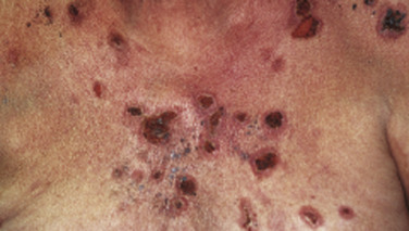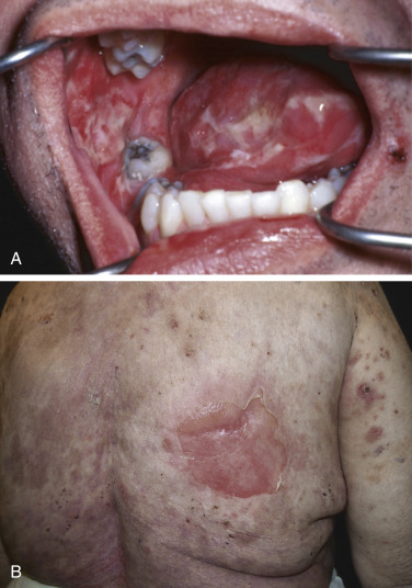 The description of paraneoplastic pemphigus (PNP) as a distinct disorder by Anhalt et al. focuses this issue in a small subgroup of patients who had a clear-cut association of pemphigus with a tumor. The patients are clinically heterogeneous and somewhat atypical. Clinical descriptions partially resemble Stevens–Johnson’s syndrome, with target lesions and painful oral lesions seen on occasion. Some patients have been described as having a papulosquamous eruption, whereas others have tense bullae. The most common associations, in descending order, are non-Hodgkin’s lymphoma, chronic lymphocytic leukemia, Castleman’s disease, and solid tumors including carcinomas, sarcomas, and melanoma. Histologically, suprabasilar acantholysis has been described in some cases, whereas keratinocyte necrosis, basal cell vacuolization, interface inflammation, and even basement membrane blisters have been described in others.