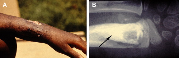 Buruli ulcer (BU), the third most common mycobacterial infection in humans next to tuberculosis and leprosy, is an emerging infection caused by Mycobacterium ulcerans . BU is characterized by indolent, typically painless necrotizing skin lesions ( Figs. 1 and 2 A). Approximately 10% of patients develop bone involvement subjacent to skin lesions or metastatic osteomyelitis from lymphohematogenous spread of M ulcerans (see Fig. 2 B). Pathogenesis is mediated by mycolactone, a diffusible, necrotizing, immunosuppressive, polyketide-derived macrolide toxin secreted by M ulcerans . In 1962, the disease was named after Buruli County, Uganda, now called Nakasongola District, where the epidemic was documented first. Other names include Bairnsdale, Kakerifu, Kasongo, or Searls’ ulcer.