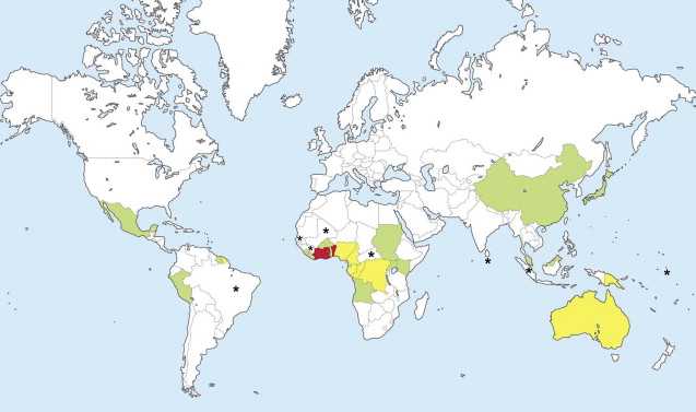 In 1998, the World Health Organization (WHO) recognized BU as a reemerging infectious disease in West and Central Africa, with a significant public health impact. The reported incidence rates of BU are highest in West Africa, especially Benin, Ghana, and Côte d’Ivoire. However, BU is reported in about 30 countries ( Fig. 3 ), and growing evidence suggests that BU is more widespread than earlier thought. BU prevails in rural tropical wetlands, especially areas with stagnant water, including ponds and swamps. However, BU is also acquired without wetland exposure.