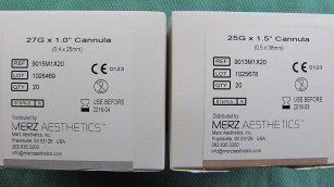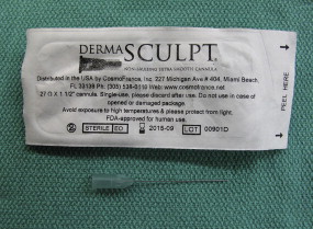 Several companies have begun manufacturing disposable microcannulas. Dermasculpt ( Fig. 2 ) is made by CosmoFrance Inc (Miami Beach, FL), Pix’L cannulas are made by Thiebaud, a French company led by Dr Luc Dewandre (manufactured in partnership with Q med), and Merz cannulas ( Fig. 3 ) are manufactured by TSK Labs (Tochigi-Ken, Japan). These microcannulas are available in a gauge range from 18 to 30. At present the 27- and 25-gauge cannulas are becoming popular with aesthetic practitioners. The available lengths include 1, 1.5, and 2 in. The author prefers the 1-in cannulas for 27 gauge, and the 1.5-in for 25 gauge. The aesthetic practitioner may choose a different gauge or length as experience is gained with their usage, depending on the technique being used and area being filled.