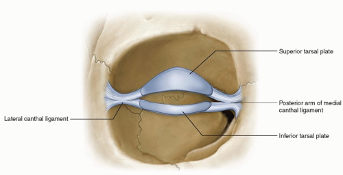 The lateral canthal tendon originates at the lateral orbital tubercle 4 to 5 mm posterior to the lateral orbital rim. This provides a posterior vector opposing the lid to the globe. The lateral canthal tendon then splits into superior and inferior segments that attach to the tarsal plates (FIG 1).