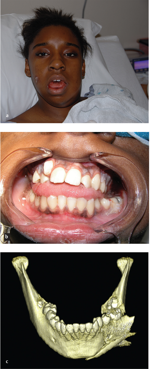 Displaced, comminuted body and angle fracture of the mandible with large butterfly fragment and malocclusion on examination