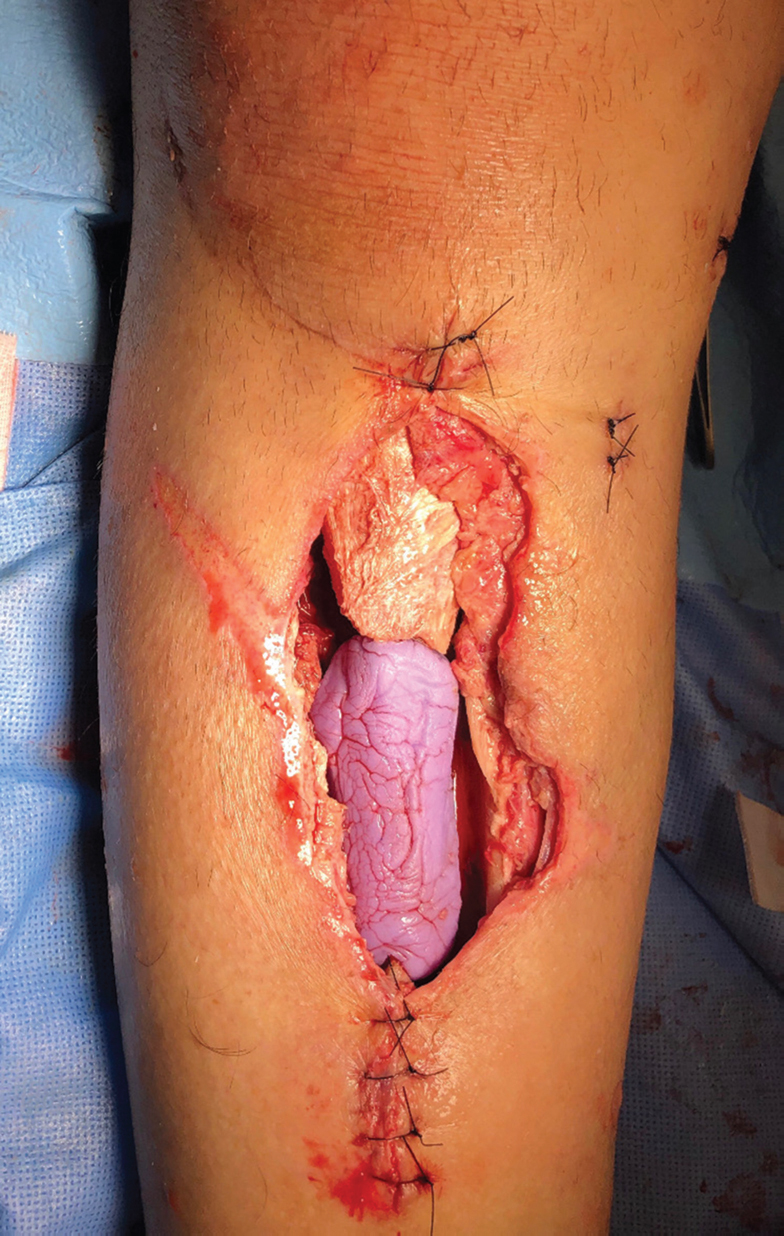 The proximal third of the anterior tibia is exposed and a bony defect with a spacer is in place
