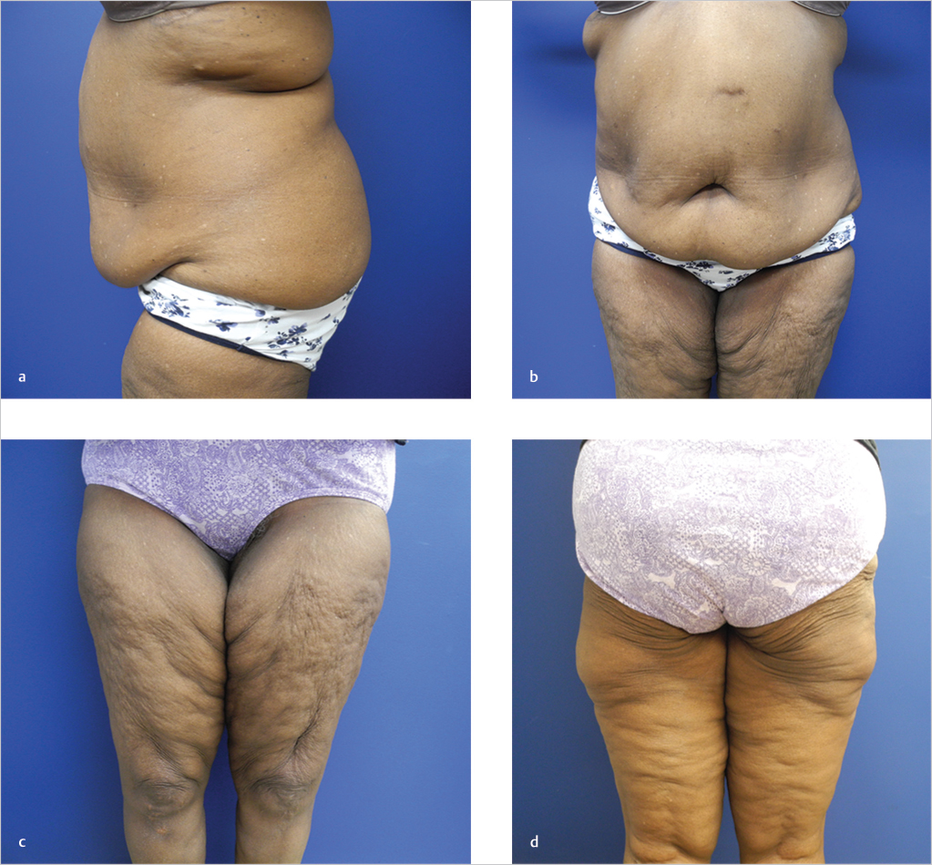 Notable abdominal skin laxity extending to posterior trunk