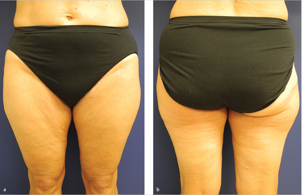 Significant, diffuse lipodystrophy noted bilaterally in saddlebag regions of upper lateral thighs