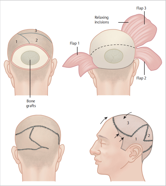 Fig. 52.1 Orticochea three-flap technique for coverage of large defects of the scalp.