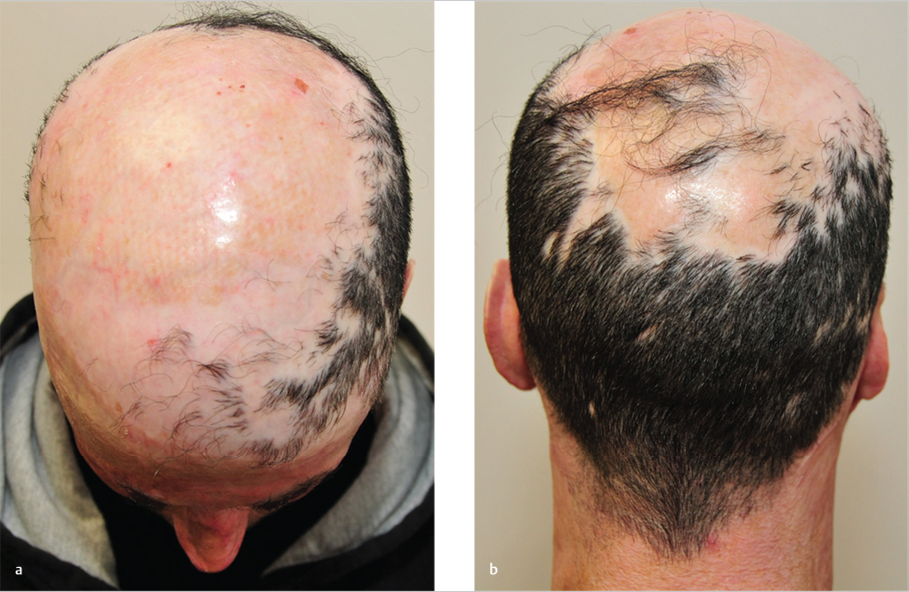 Case 52 (a, b) A 45-year-old man with history of burns to the scalp after a work-associated explosion presents for scalp reconstruction.