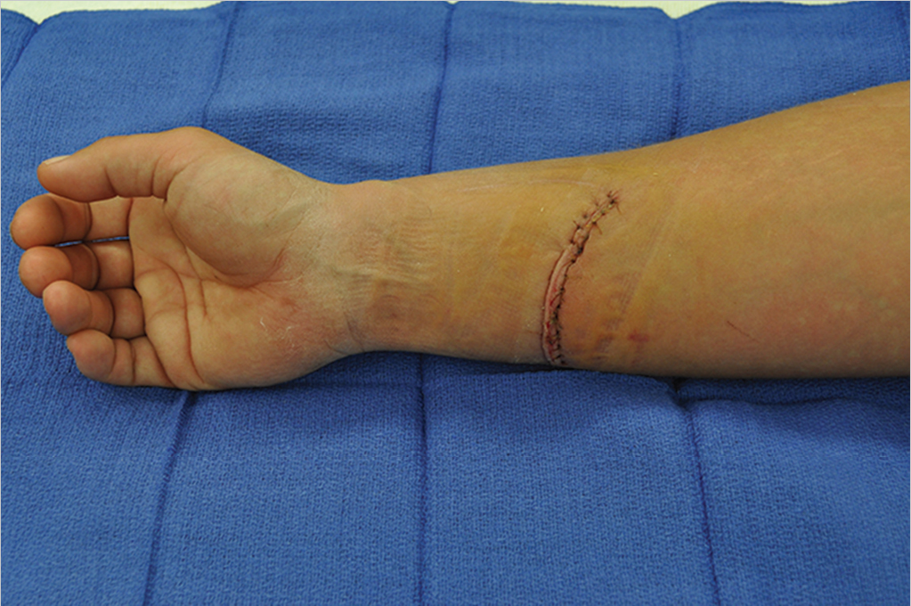 Case 57 A 28-year-old female presents to the clinic after sustaining a laceration to her right forearm 2 days ago. She was initially seen in the emergency department after punching a mirror, where the wound was washed out and skin repaired. She describes numbness in her thumb, and index and middle fingers as well as weakness in the hand.