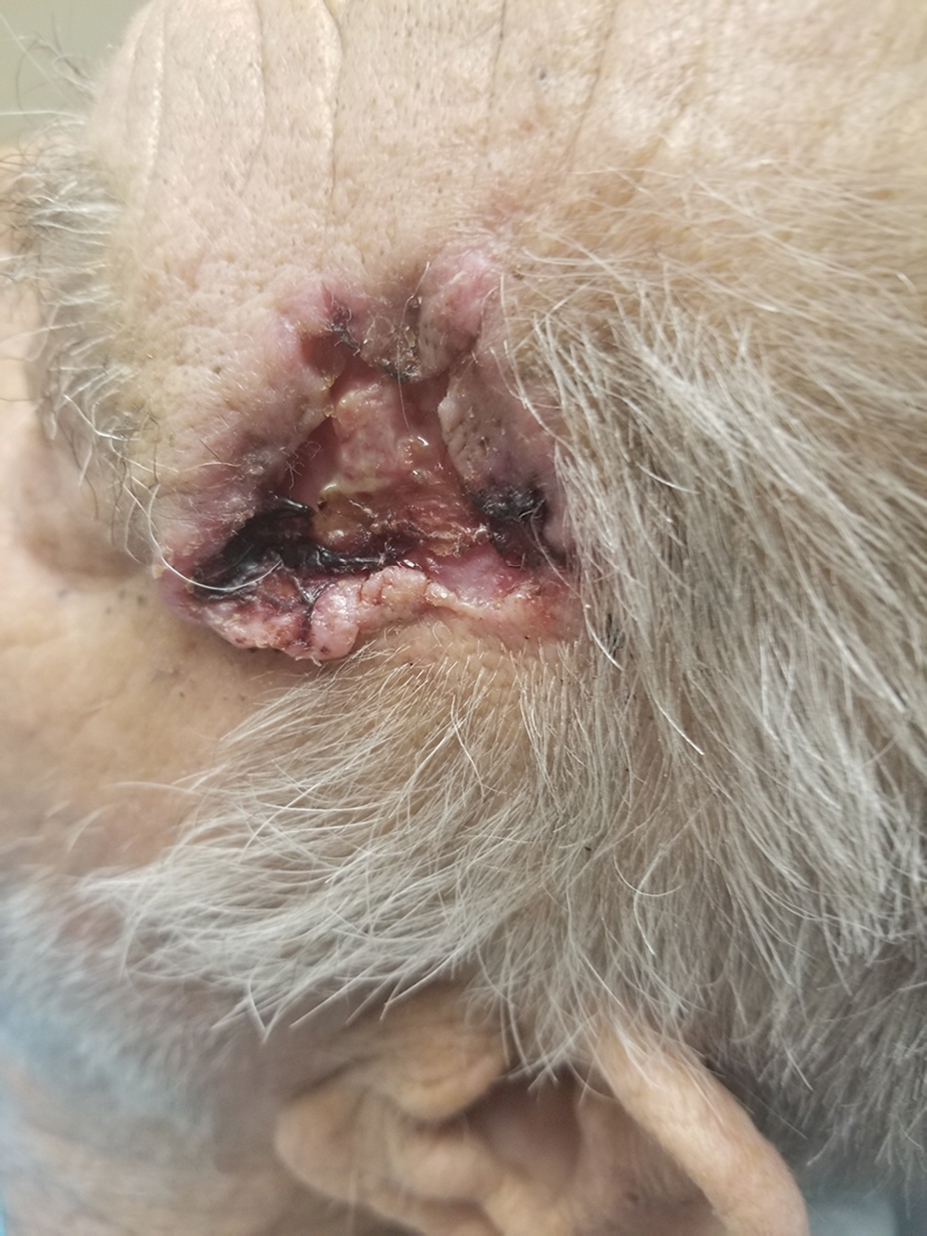 Large, eroded, pearly pink plaque with telangiectasia located on the left temple, involving the temporal hairline, and demonstrating evidence of ulceration.