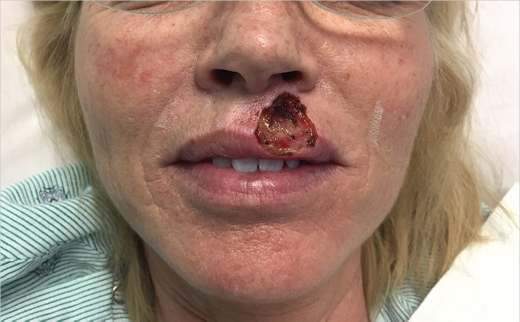 Partial thickness central upper lip defect involving roughly 1/4 of the upper lip