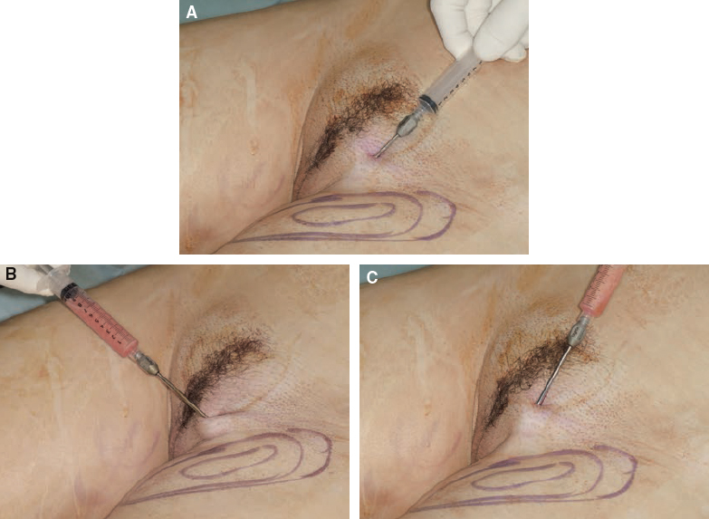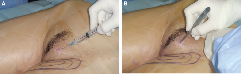 The lidocaine solution is first placed into the incision site through a sharp 25-gauge needle; incisions are then made with a No. 11 blade. The incisions for infiltration of anesthetic solutions are usually the same ones used for harvesting fatty tissue. These incisions are just large enough (usually 2 mm) to permit insertion of the tip of the harvesting cannula.