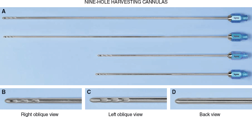 The length of the harvesting (aspirating) cannula is most often 15 cm. Although the commonly used 26 cm cannula has a greater reach, it can place greater torque on the Luer-Lok aperture and break the syringe tip during extraction. The surgeon has greater control of the tip of the cannula with the 15 cm cannula to avoid untoward incidences (see Chapter 52). It is thus advisable to use the shorter cannulas initially and to advance to longer ones after becoming more familiar with the instruments. These are also used for infiltration of the harvesting fluids.