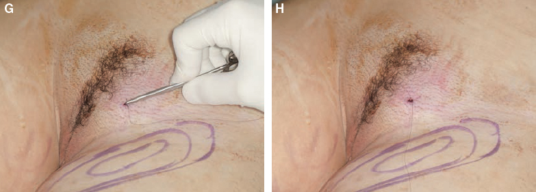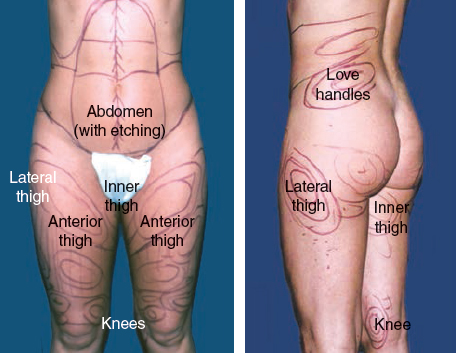 Harvesting sites are accessed through incisions placed in creases, previous scars, stretch marks, or hirsute areas (circled in red) whenever possible. The pubic region is the most useful site, because the abdomen, medial thigh, and anterior thigh can be reached with ease. To harvest fat from the upper abdomen and flanks, additional incisions can be made in the umbilicus and upper abdomen. Occasionally, an incision in the lateral hip can be used for access to the thigh as well as to the lower love handle. Incisions in the midback and lateral sacrum provide access to the love handles and the flank.