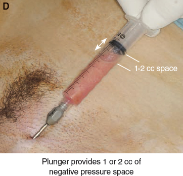 The plunger of the syringe is gently manipulated to provide 1 or 2 cc of negative pressure space in the barrel of the syringe while the cannula is pushed through the harvest site. All incision sites are closed with nylon interrupted sutures after harvesting is completed.