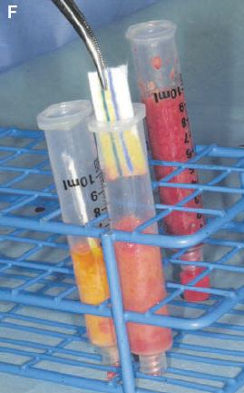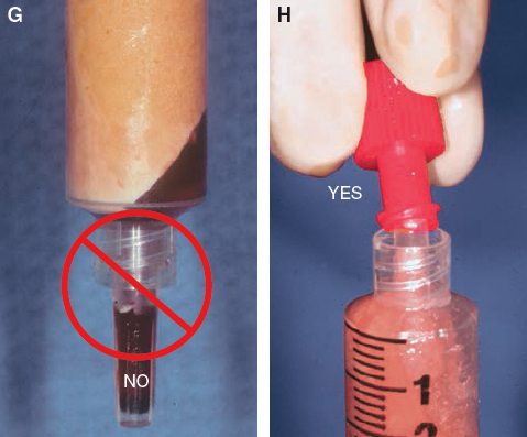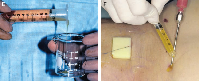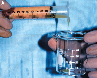 After the oil is decanted, the plug can be removed from the Luer-Lok connection. A collection vessel should be used during this maneuver, because the aqueous component will usually pour out of the syringe. Occasionally a small wad of tissue at the opening will prevent the fluid from exiting, in which case the proximal end of the syringe should be tapped lightly to free the obstructing tissue and allow the aqueous portion to drain out. On rare occasions it may be necessary to use a hemostat to pull out a bit of tissue from the aperture of the Luer-Lok syringe.