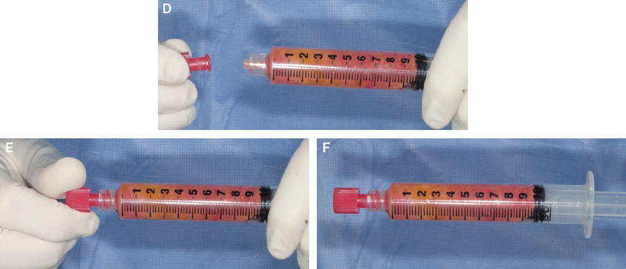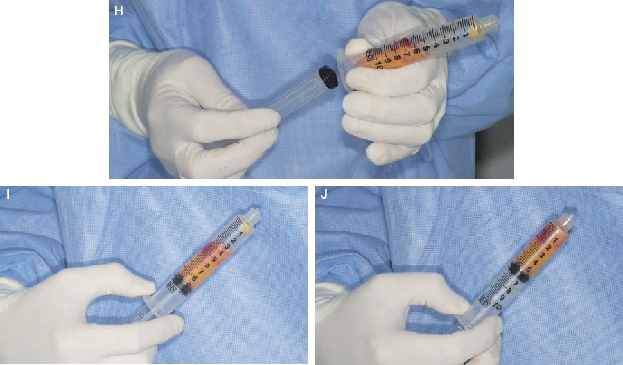 The inserted cannula is attached to a 10 cc Luer-Lok syringe by the Luer-Lok connection. The plunger is pulled back gently to minimize negative pressure. Only 10 cc syringes are used for harvesting; these are small enough to be manipulated manually without locking devices. Larger syringes are more cumbersome, and pulling back even slightly on the plunger in larger syringes might create damaging negative pressures.