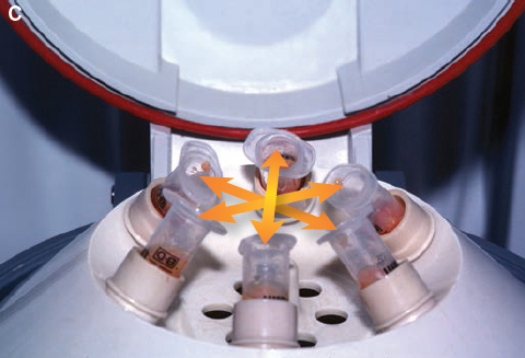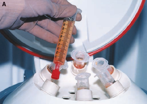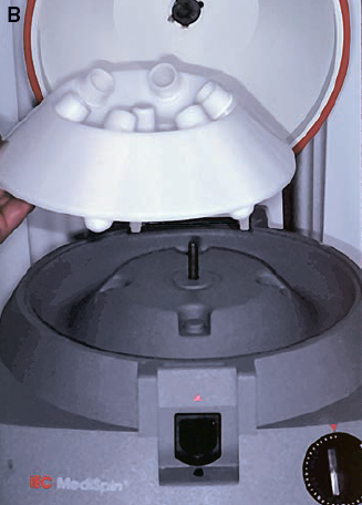 After the rotor of the centrifuge has stopped completely, the circulating nurse should open the cover and the sterile technician should remove the centrifuged syringes, being careful not to touch the cover or other nonsterilized parts of the centrifuge.