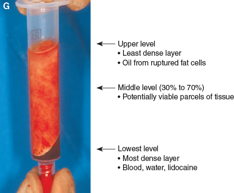 Tumescent techniques are avoided during the harvesting phase. I believe that the motion of the harvested fat through large amounts of liquid in tumescent techniques may disrupt the architecture and release growth factors (see Chapter 9). This disruption of the intrinsic tissue architecture and release of growth factors may decrease the potential survival of the subcutaneous tissues. If less than 1 or 2 cc of the harvested material in each syringe is fat, then as many as fifty 10 cc syringes may be necessary to obtain 60 cc of fat; this can prolong the procedure by hours.