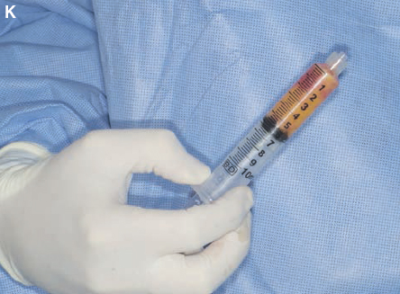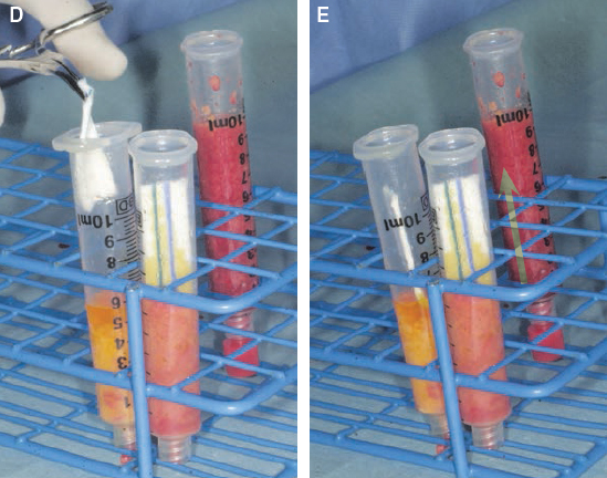 The oil layer is initially decanted before removing the plug from the Luer-Lok syringe. If the plug is removed before decanting, it will cause the vacuum that holds the contents in place to be lost, and the contents of the syringe will leak out during the decanting process. (This oil is used for lubricating both the harvesting and insertion site incisions.)