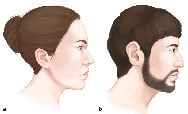 In the lateral view, with the male patient’s head oriented in the horizontal Frankfurt line, we expect a vertical line dropped off the lower lip to be at least at the level of the chin ( Fig. 12.1 ). For an individual with an exceptionally strong jawline, the chin may be several millimeters in front of this line. This is in contrast to a female’s chin that would be aesthetically pleasing at approximately 2 mm posterior to this line1 ( Table 12.1 ).