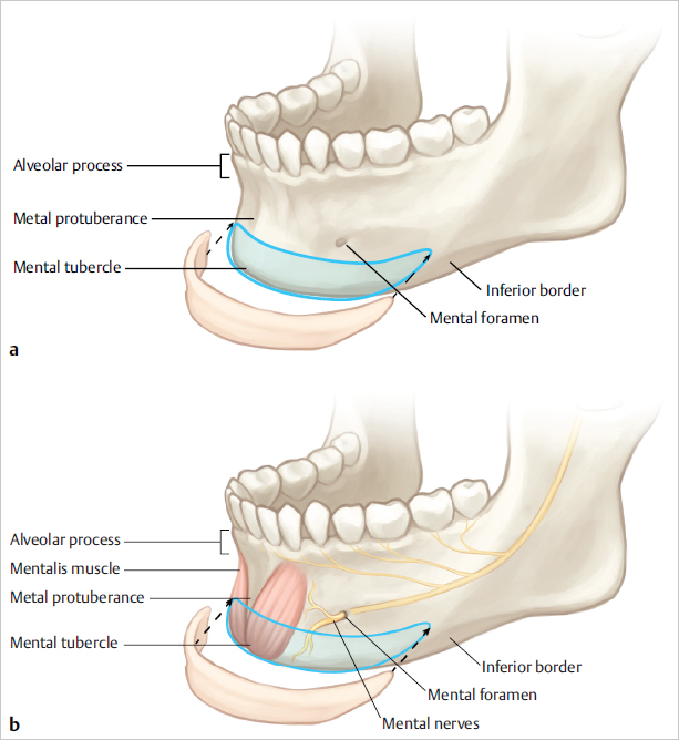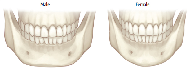 The midline lower face is a rather safe operative field. Below the skin or subcutaneous tissue, we find the mentalis muscle followed by the periosteum and the anterior mandible itself ( Fig. 12.2 ). The terminal branches of the mandibular nerve (V3) exit the mandible at a vertical line down from the midpupillary line. Intraorally, the nerve can be identified between the mandibular canine and the first premolar. We prefer the external approach for placement of our implants and find that the submental crease often hides the incision well. 1 It’s important to also note that the female chin comes more to a point, while the male chin often has a squared anterior appearance ( Fig. 12.3 ).