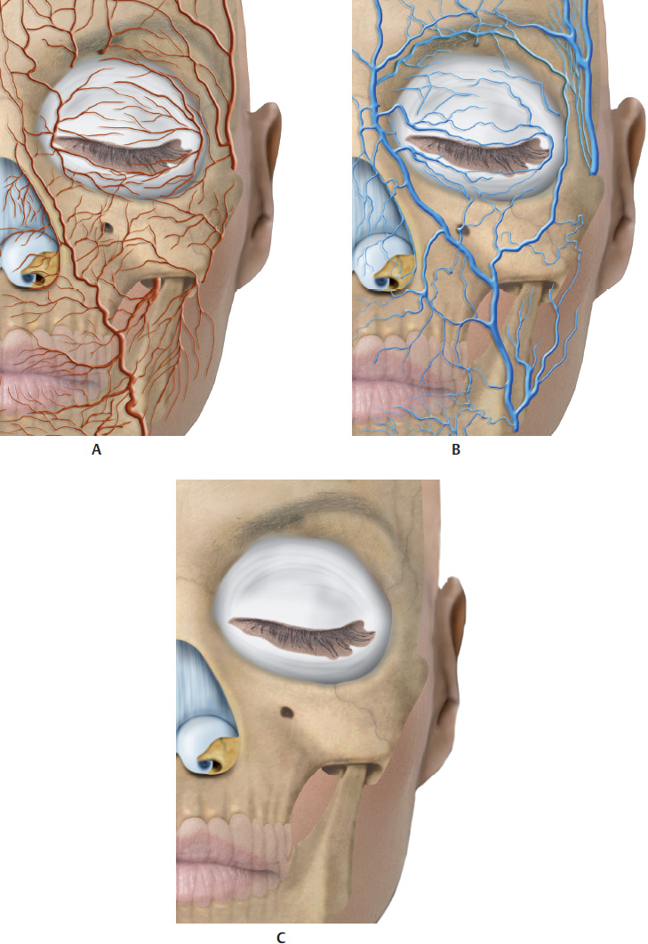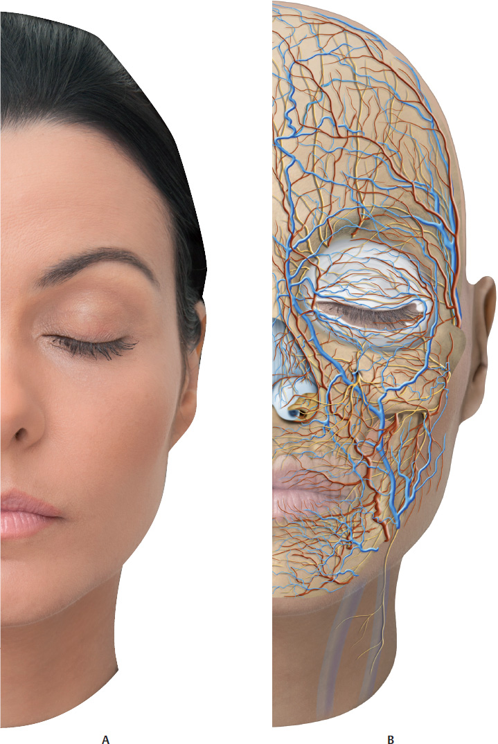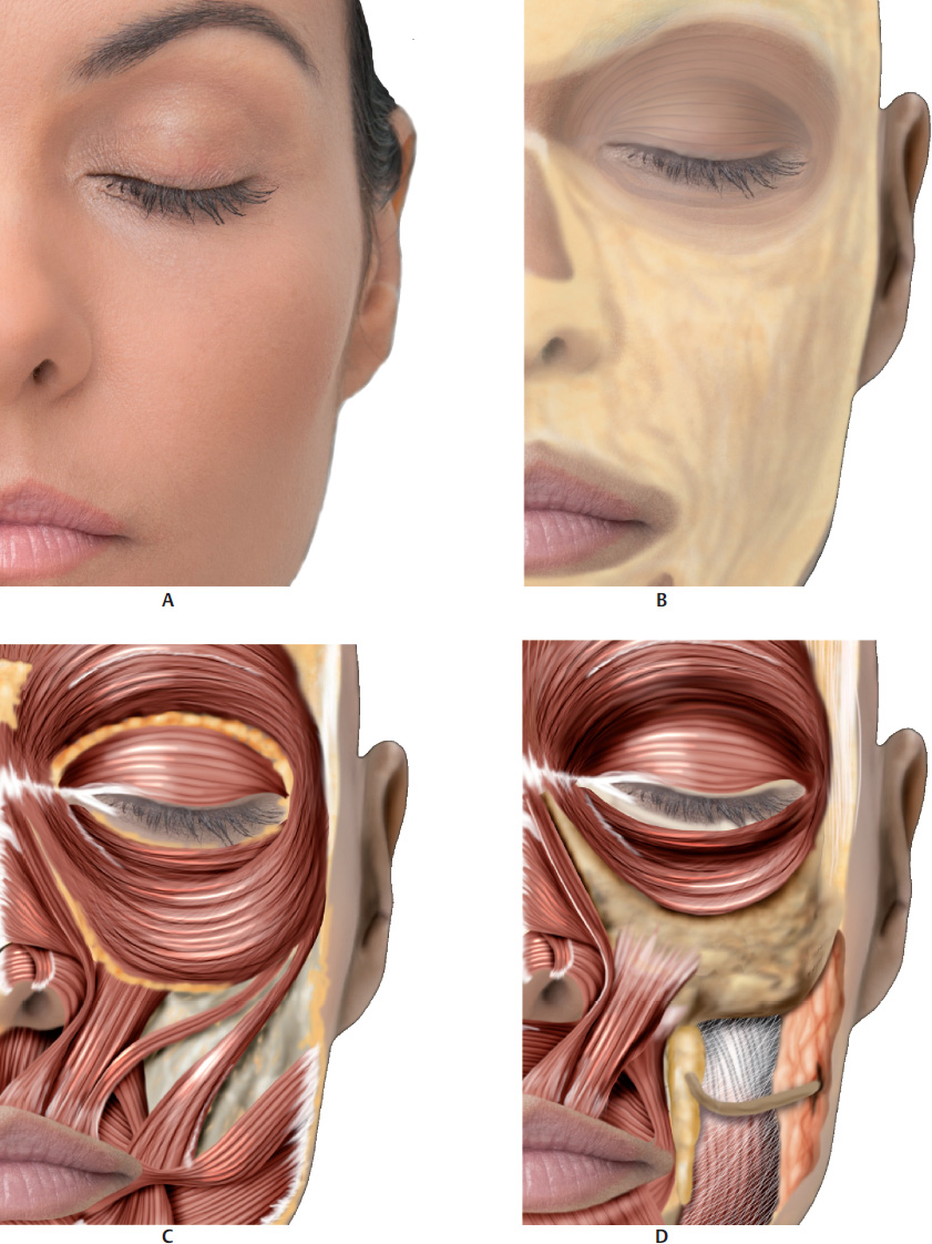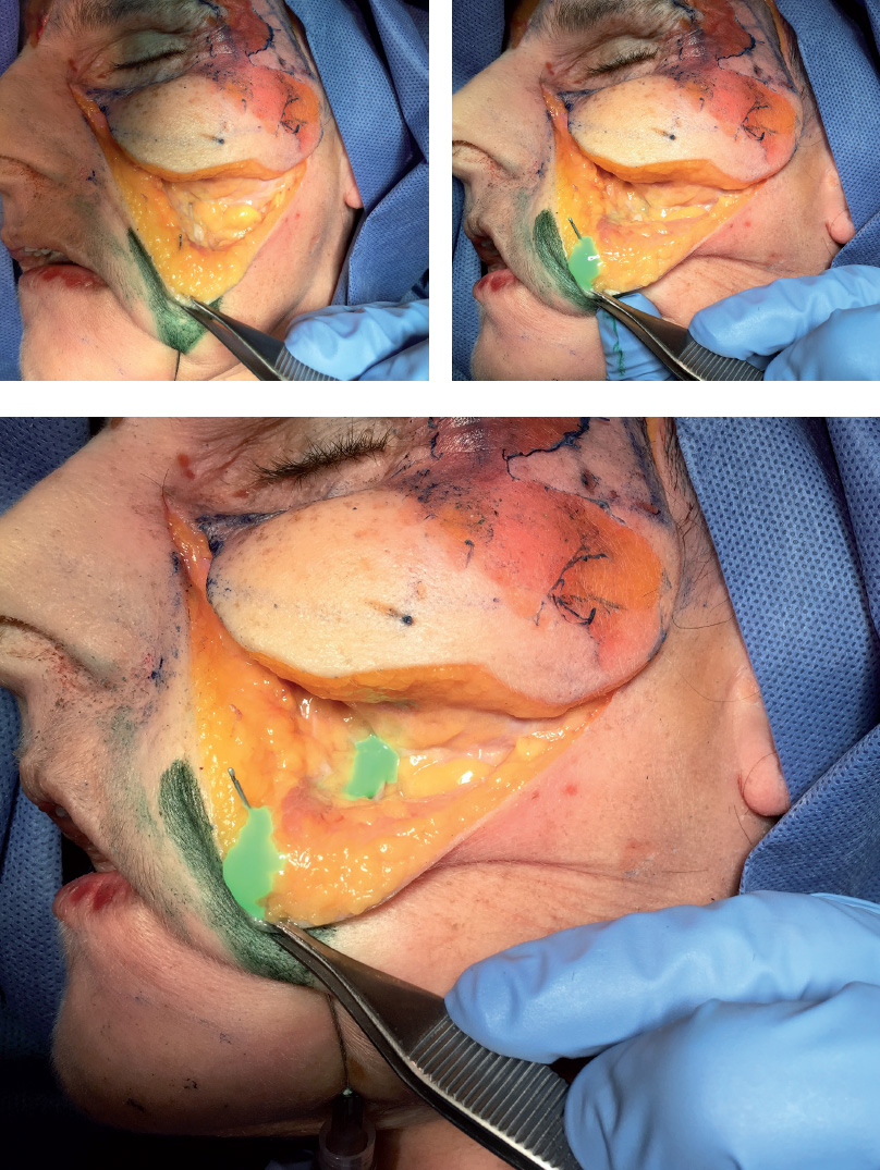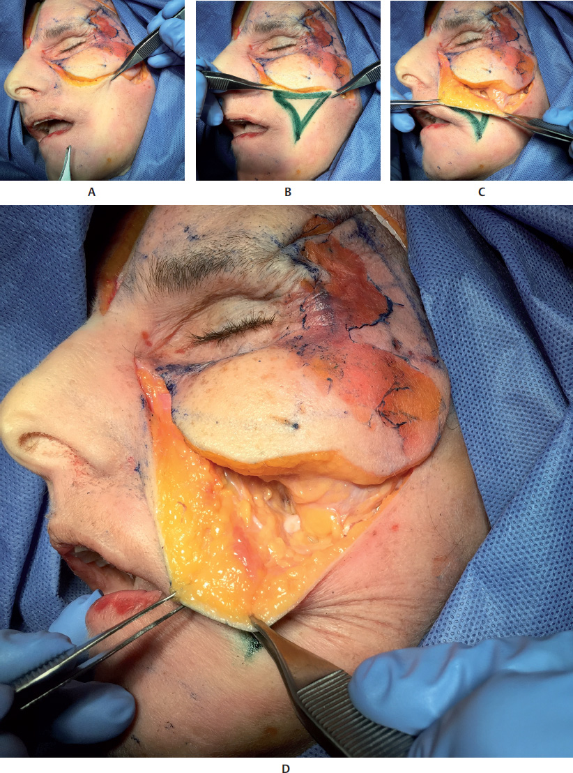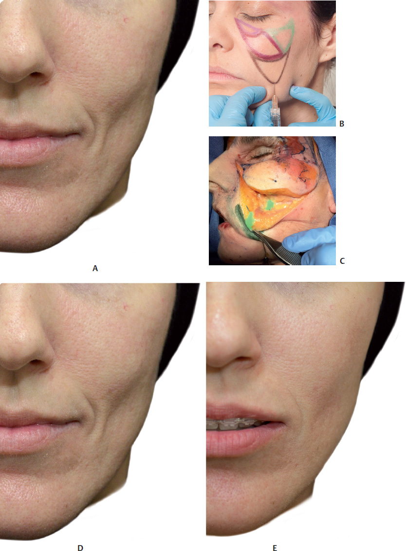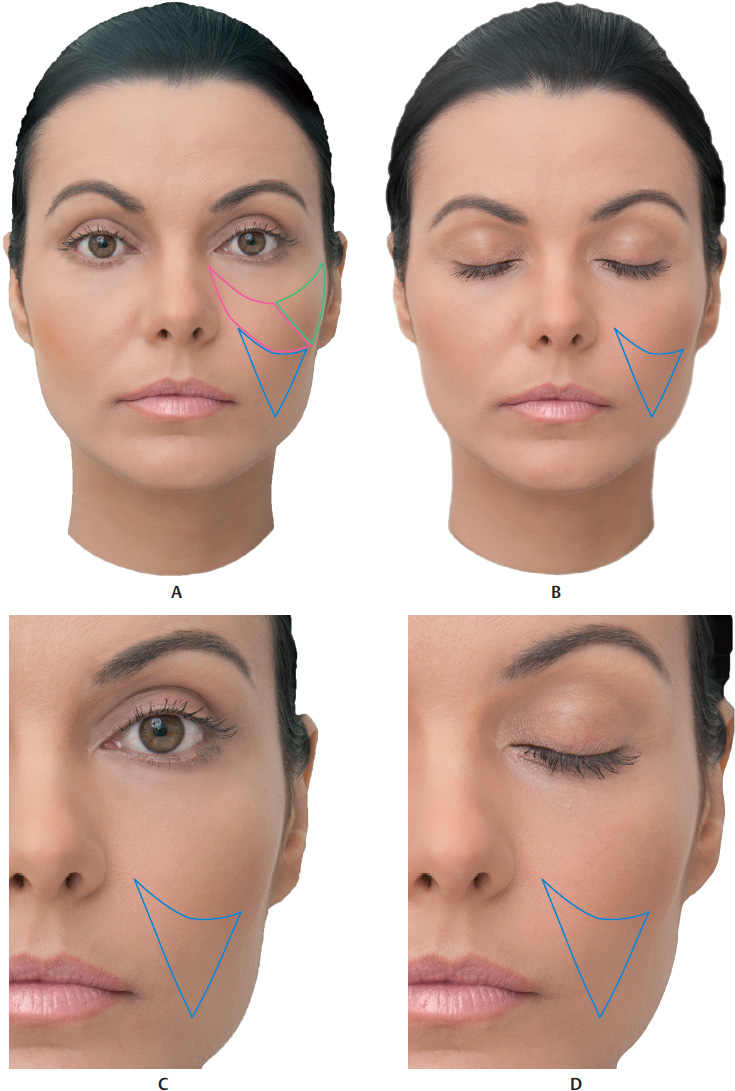1 Tobias GW, Binder WJ. The submalar triangle: Its anatomy and clinical significance. Facial Plast Surg Cl. Facial Contouring and alloplastic implants. 1994;2(3):255–632 Stuzin JM, Wagstrom L, Kawamoto HK, Baker TJ, Wolfe SA. The anatomy and clinical applications of the buccal fat pad. Plast Reconstr Surg 1990;85(1):29–37Fig. 13.1 A. Anterior view of the anatomy of the submalar region.B. Same region after removal of the skin to expose the superficial fat pads (SFPs) and focus on the buccal fat pad.C. Same region after removal of the skin and the SFPs.D. Same region after removal of the skin, SFPs, orbital portion of the orbicularis oculi muscle (OM), and zygomatic muscles. Parts of the buccal fat pad, parotid duct (above the masseter), and parotid gland are visible.Fig. 13.2 A. Anterior view of the anatomy of the submalar region after removal of the skin, superficial fat pads (SFPs), palpebral and orbital portions of the orbicularis oculi muscle (OM), and zygomatic muscles.B. Same. region after removal of the skin, the SFPs, the palpebral and orbital portions of the OM, the medial and lateral suborbicularis oculi fat (SOOF), the levator muscle of the upper lip, and the zygomatic major and minor muscles.C. Same. region after removal of the levator muscle of the upper lip and the ala of the nose, and the levator muscle of the angle of the mouth. Parts of the buccal fat pad, dissected parotid duct, masseter muscle, and parotid gland are visible.D. Bone. structure of the submalar region and a part of the buccinator muscle.Fig. 13.3 A. Anterior view of the left side of the face of a 3D digital model andB. Vessels, arteries, and nerves of the submalar region.Fig. 1.2 Anterior view of the face focusing on the submalar region.A. Corresponding arterial vascularization.B. Corresponding venous vascularization.C. Bone structure of this region.Fig. 13.5 A. Lateral view of the right side of the face of a 3D digital model.B. Same region after removal of the skin, showing superficial fat pads (SFPs).C. Same region after removal of the skin and the SFPs. Palpebral and orbital portions of the orbicularis oculi muscle (OM) can be seen, with the latter portion over the medial and lateral suborbicularis oculi fat (SOOF) pads. The levator muscle of the upper lip and ala of the nose can be seen, as well as the levator muscle of the angle of the mouth, and the zygomatic major and minor muscles above the deep fat pads (DFPs).D. Same region after removal of the orbital portion of the OM, medial and lateral SOOF pads, SFPs, and DFPs. A part of the buccal fat pad (Bichat’s fat pad) can be seen above the buccinator muscle.E. Bone structure of the submalar region.Fig. 1.2 Right profile view with focus on the submalar region.A. Corresponding vascularization and innervation.B. Corresponding arterial vascularization.C. Corresponding. venous vascularization.D. Arterial. and venous vascularization integrated in the frontal muscle, orbicularis oculi muscle (OM), nasal muscles, greater zygomatic muscle, levator muscle of the lip, buccinator muscle, and masseter muscle.E. Corresponding. innervation.Fig. 13.7 A andB. Anterior view of the delimitation of the submalar triangle.C andD. Close-ups ofA andB.Fig. 13.8 A. Left side of the face of a fresh cadaver specimen.B andC. Skin has been folded back to show the superficial portion of the buccal fat pad (Bichat’s fat pad).D. Buccal fat pad in detail.Fig. 13.9 A. Left side of the face of a fresh cadaver specimen with skin folded back showing delimitation of the malar and zygomatic superficial fat pads (SFPs) (marked in pink).B. Delimitation of the superficial portion of the buccal fat pad (Bichat’s fat pad) (marked in blue).C. The specimen after removal of the superficial portion of the buccal fat pad.D. Deep portion of the buccal fat pad being pinched.E. Deep portion of the deep buccal fat pad (Bichat’s fat pad) in detail.Fig. 13.10 A. Left side of the face of a fresh cadaver specimen with buccal fat pad being pinched; the facial artery can be seen at the front.B. Illustration showing the buccal fat pad between the facial artery and vein.C. Pinching. of the facial artery.D. Illustration of the facial artery.E. Pinching of the facial vein.F. Illustration of the facial vein.Fig. 13.11 Left side of the face of a fresh cadaver specimen after removal of the superficial fat pads (SFPs) and pinching ofthe buccal fat pad (Bichat’s fat pad).Fig. 13.12 Left side of the face of a fresh cadaver specimen and illustration after removal of the superficial fat pads (SFPs). Note the deep portion of the buccal fat pad (Bichat’s fat pad) and its extension up to the temporal region.Fig. 13.13 A, B, andC. Left side of the face of a fresh cadaver specimen showing delimitation of the submalar triangle (markings in green) and the superficial portion of the buccal fat pad.D. Superficial portion of the buccal fat pad being folded back to show the deep buccal fat pad, located below the superficial muscular aponeurotic system (SMAS).Fig. 13.14 Demonstration of a filler injection technique in the submalar triangle with a cannula in the deep buccal fat pad, below the superficial muscular aponeurotic system (SMAS). Note thegreen product. in the deep plane, below the levator muscles of the upper lip.Fig. 13.15 Demonstration of a filler injection technique in the submalar triangle with a cannula in the superficial buccal fat pad, above the superficial muscular aponeurotic system (SMAS). Note thegreen product in the subcutaneous plane, above the zygomatic muscle.Fig. 13.16 Demonstration of a filler injection technique in the submalar triangle with a needle in the superficial buccal fat pad, above the superficial muscular aponeurotic system (SMAS). The procedure can be performed with a linear antegrade or retrograde injection.Fig. 13.17 A. A patient with loss of volume in the region of the submalar triangle.B. Delimitation of the area to be filled.C. Filler injection in the area using the cannula t