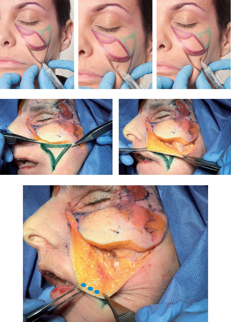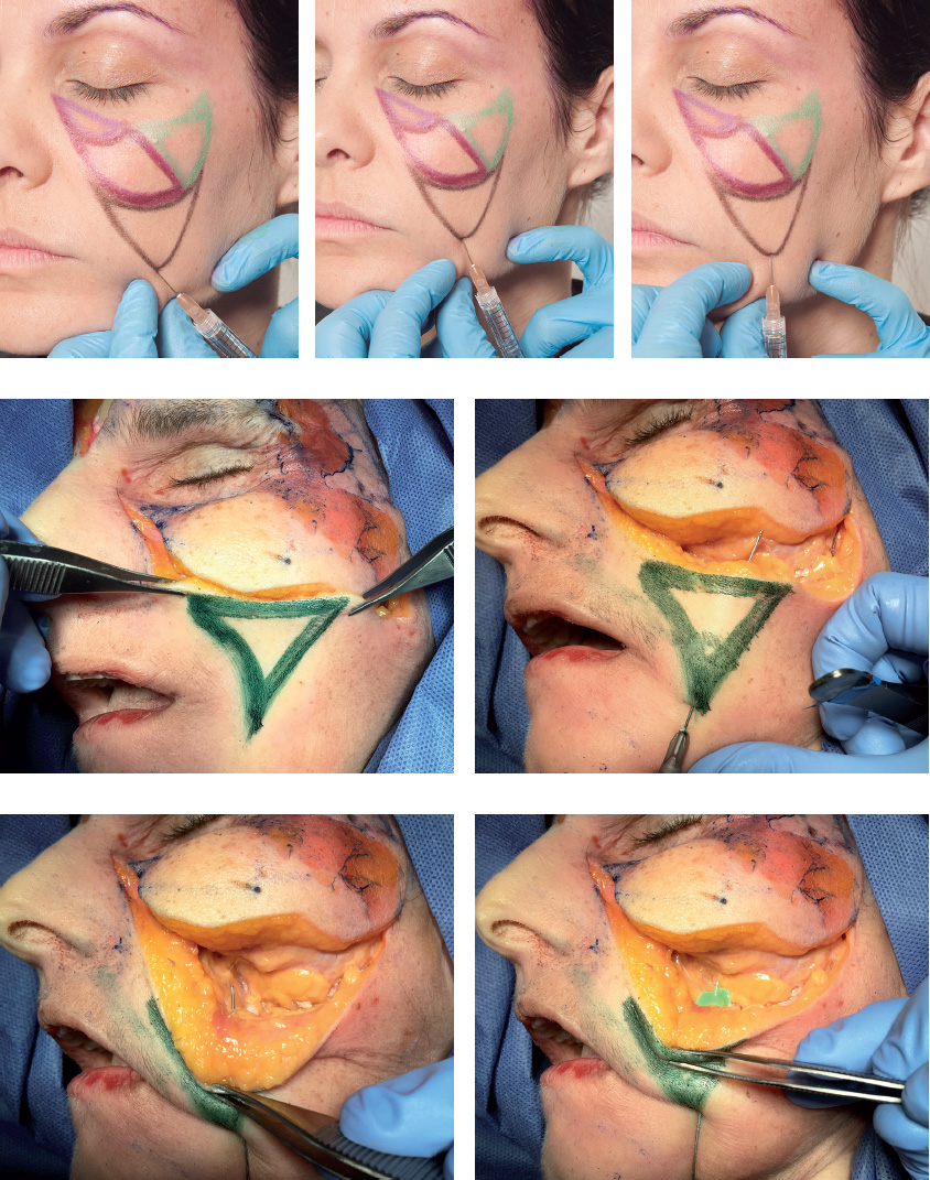 Loss of volume in the submalar region manifests clinically in the form of an inverted triangle, which is delimited medially by the nasolabial fold, superiorly by the body of the zygomatic bone, and laterally by the masseter muscle. The buccal fat pad (Bichat’s fat pad) gives volume to the submalar triangle. It is a fundamental component in this system, and is exceptionally sensitive to weight loss, trauma, cachexia, and, in particular, aging process. In cases of advanced atrophy, the patient has a skeletonized appearance.