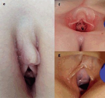 One study assessed genital dimensions in prepubertal children from 1 month to 10 years, and developed algorithms to predict expected measurements according to age, weight and height [6]. For older children, significant variation continues to be seen in the external anatomy [7] (see Figure 2.2). A study assessed 58 girls and observed a linear relationship between age and genital dimensions. The clitoral hood was noted to be a separate structure from the labia minora in all age groups, reflecting its embryological origins. A variety of shapes were noted, being variously described as a horseshoe, trumpet, coffee bean or tent. All of these papers illustrated wide diversity in genital dimensions, yet the information is promoted as having applicability for those seeking to alter the vulval area for cosmetic reasons [6].
