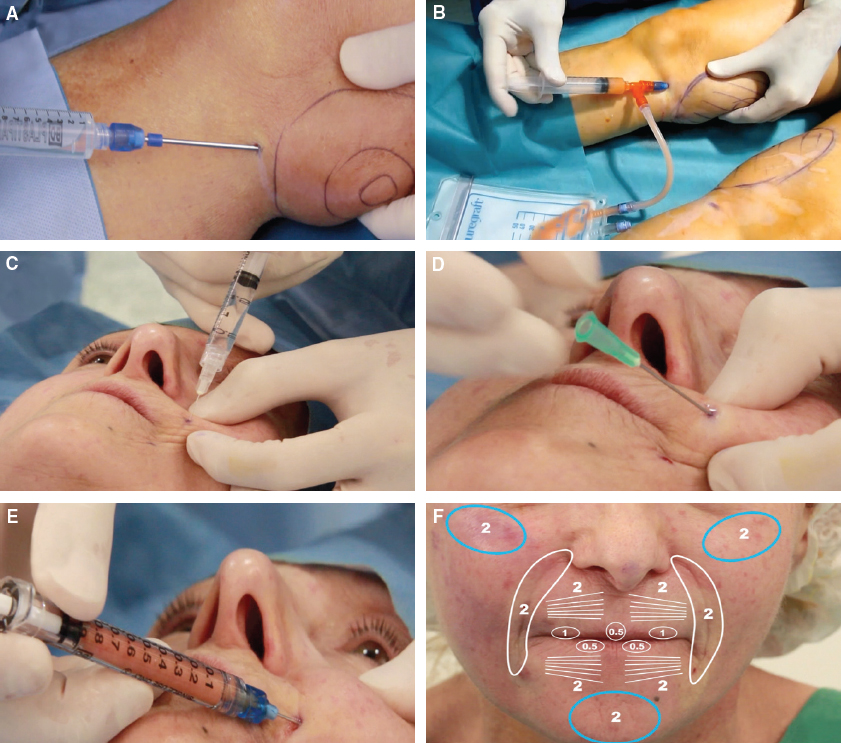 The steps of fat micrografting for the treatment of SSc of the face are shown. Local infiltration is done, in this case, in the inner aspect of the knee (a preferred site for harvesting) (A). After an interval in which the lidocaine takes effect, microharvesting is performed with a closed system (B). The lipoaspirate is processed (as described under Purification). A local anesthetic is injected in the affected areas of the face (C), and the entry point is punctured with a 21-gauge (0.8 mm) needle (D). Micrografting is performed with a 1 cc syringe and a 21-gauge (0.8 mm) cannula (E). The fat placement and quantities in this patient (total 21.5 cc) are shown (F).